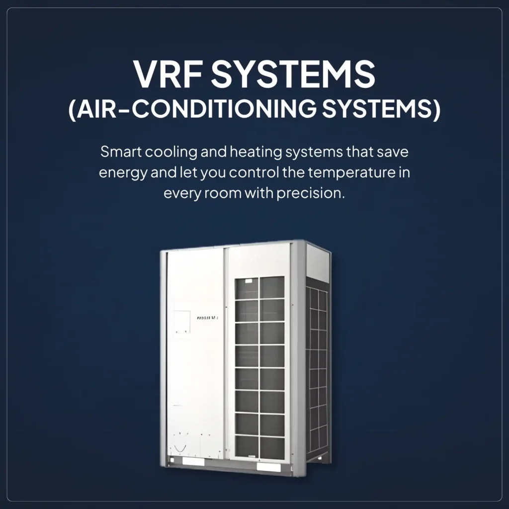 A Variable Refrigerant Flow (VRF) system is an advanced technology that adjusts refrigerant flow based on real-time temperature needs, ensuring zone-wise comfort and high energy efficiency.
